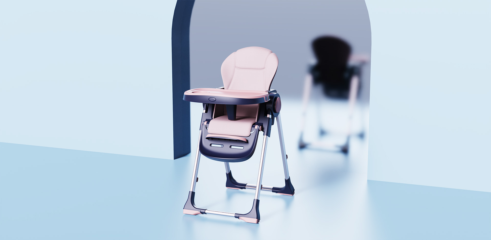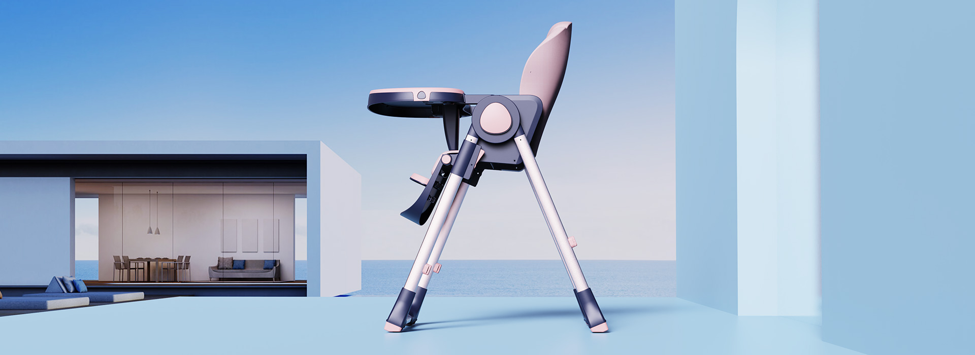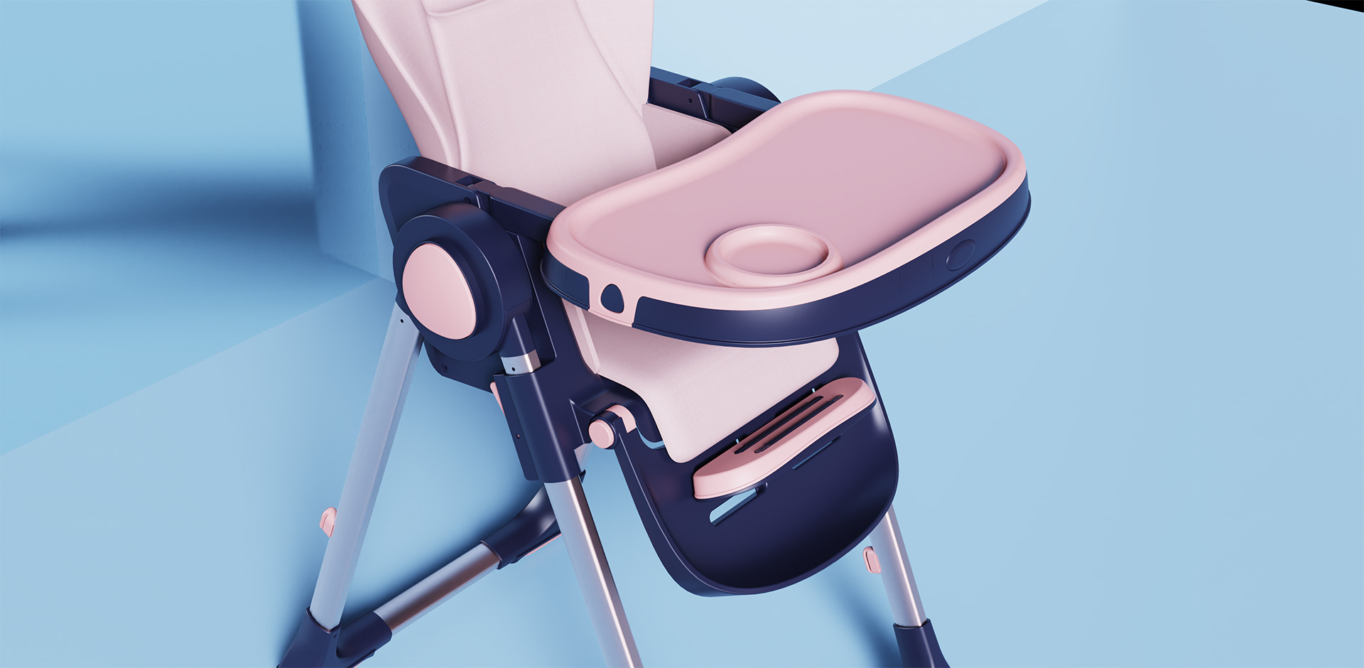 兒童餐椅采用三角結(jié)構(gòu)與四點(diǎn)支撐的結(jié)構(gòu)形式,以保證餐椅的安全性,側(cè)面旋轉(zhuǎn)功能按鈕以三角造型呈現(xiàn),與之三角結(jié)構(gòu)相呼應(yīng)。